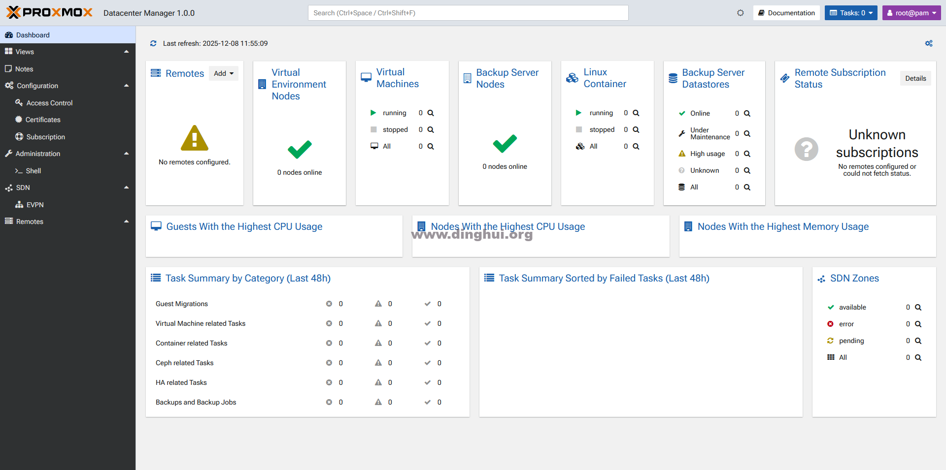 从官网介绍看,Proxmox Datacenter Manager 主要是简化IT运维,比如前端提供多个小部件工具包和更加现代化的 Web 用户界面体验,在可访问性、访问速度和兼容性方面都有不错的提升,可以为 PVE 用户提供更好的体验。可以将所有的 Proxmox VE 集群、节点及 Proxmox Backup Server 实例链接并呈现在单一界面中。虚拟机可以跨集群实时迁移,管理员还可以查看整个 Proxmox VE 与 Proxmox Backup Server 基础设施的所有可用更新,并可直接从 Datacenter Manager 界面部署补丁。