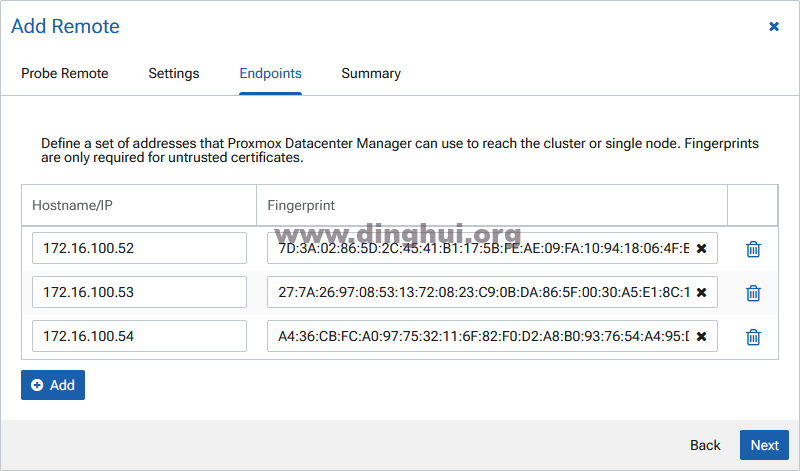 点击Add,选择 Proxmox VE,填写节点Proxmox VE 所属的 IP 地址及端口号 8006