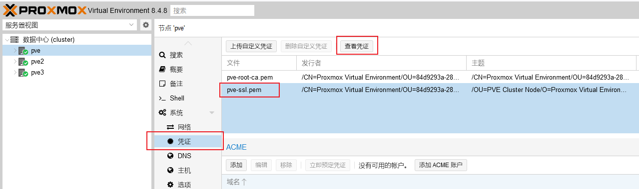 注意这里的指纹,指的是 Proxmox VE 的指纹,需要登录 Proxmox VE Web 后台,数字中心,系统子菜单,凭证处获取。