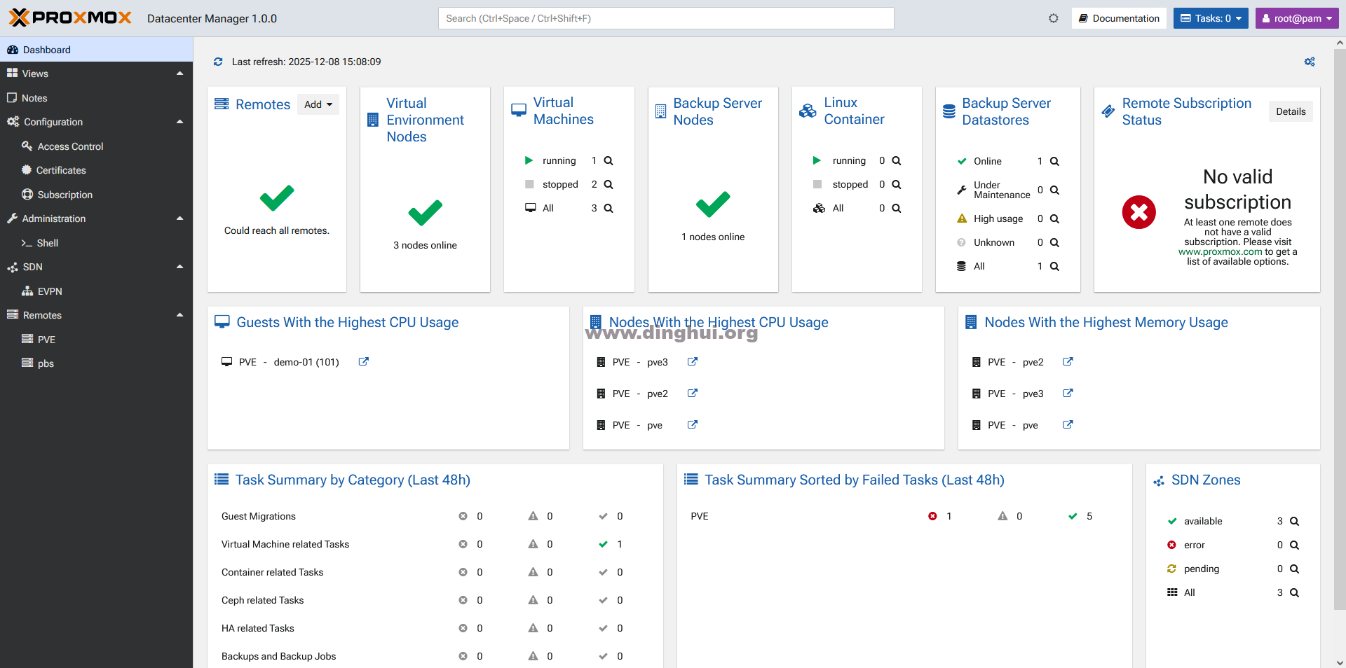 完成添加之后,Proxmox VE 集群的节点以及 Proxmox Backup Server 都被加入到PDM,如下图。