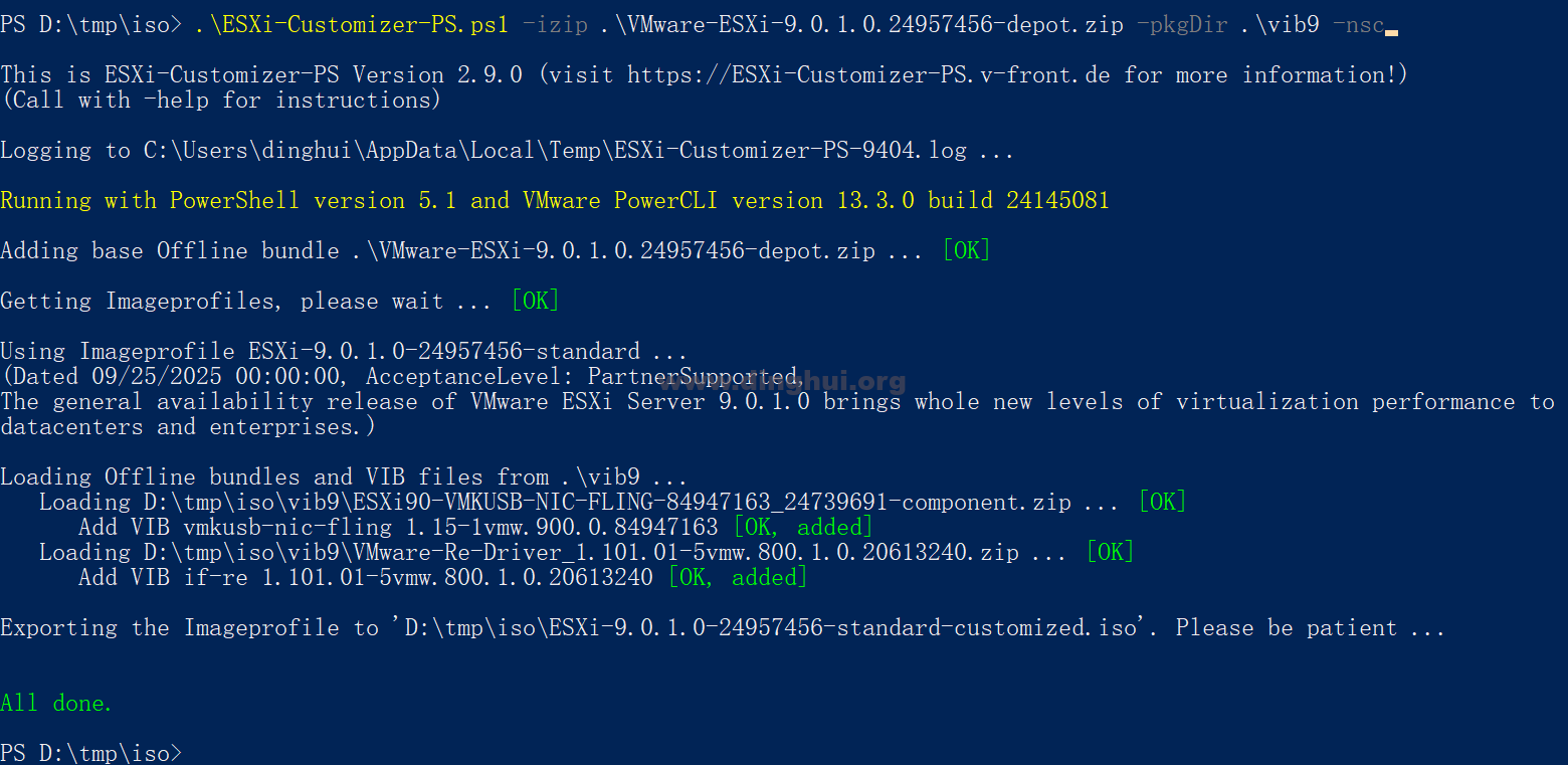 .\ESXi-Customizer-PS.ps1 -izip .\VMware-ESXi-9.0.0.0.24755229-depot.zip -pkgDir .\vib9 -nsc