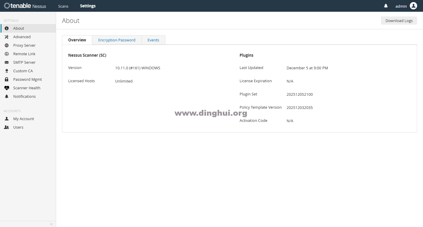 重新登录NESSUS页面,成功登录进去后,右上角有一个圈圈一直在转,时间略长,鼠标悬浮在上面会有进度,等加载完后,圈圈会消失,About页面可以看到漏洞库更新到最新版。
