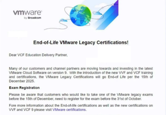 近期,VMware by Broadcom 发布 End-of-Life VMware Legacy Certifications!邮件通知。
