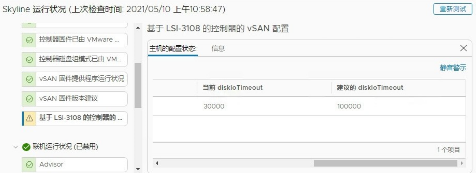 2021年05月10日 vSAN Skyline 运行状况告警:基于 LSI-3108的控制器的vSAN配置 dinghui.org 在 VMware 标签 vSAN 3,952 次浏览 (点击 4,051 次) 有一处客户vSAN健康检查告警如下图: 显示diskIoRetryFactor和diskIoTimeout都不是建议值。该客户的控制卡为DELL PERC H730P。 解决办法: ssh登录告警主机,执行以下命令; esxcfg-advcfg -s 100000 /LSOM/diskIoTimeout esxcfg-advcfg -s 4 /LSOM/diskIoRetryFactor 该命令执行后立即生效,不需要重启,再次运行Skyline检查,已经显示正常。 打赏赞(1)微海报分享 相关文章: 使用旧格式版本格式化 vSAN 磁盘组